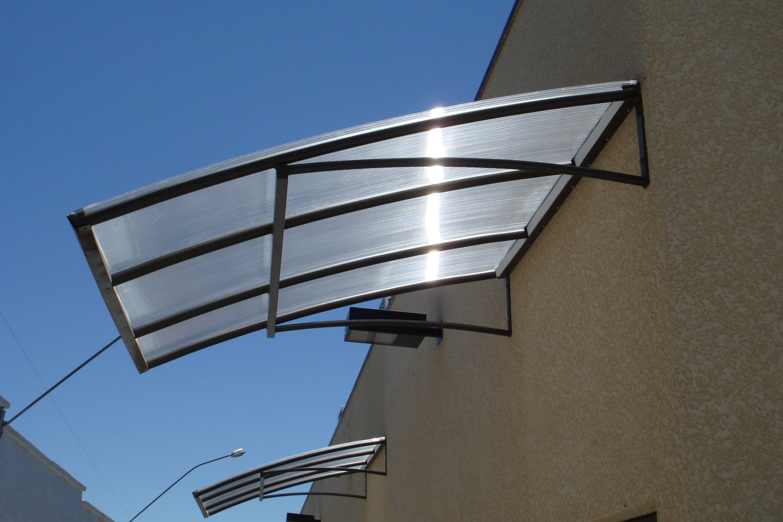 Estrutura fixa robusta com opções em Policarbonato Compacto (beleza semelhante ao vidro) ou Alveolar (alta resistência). Um acabamento premium que moderniza e valoriza o seu imóvel.